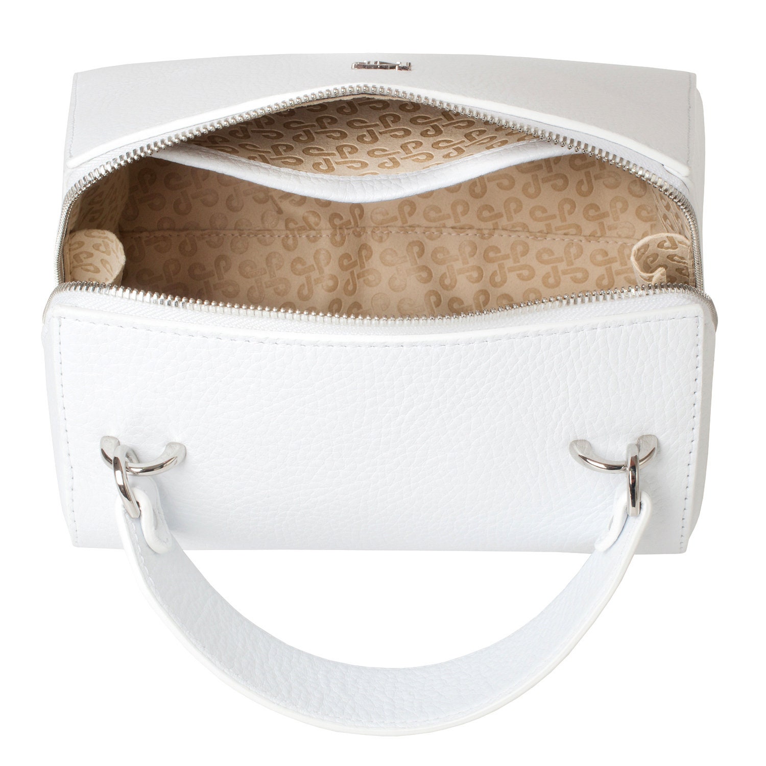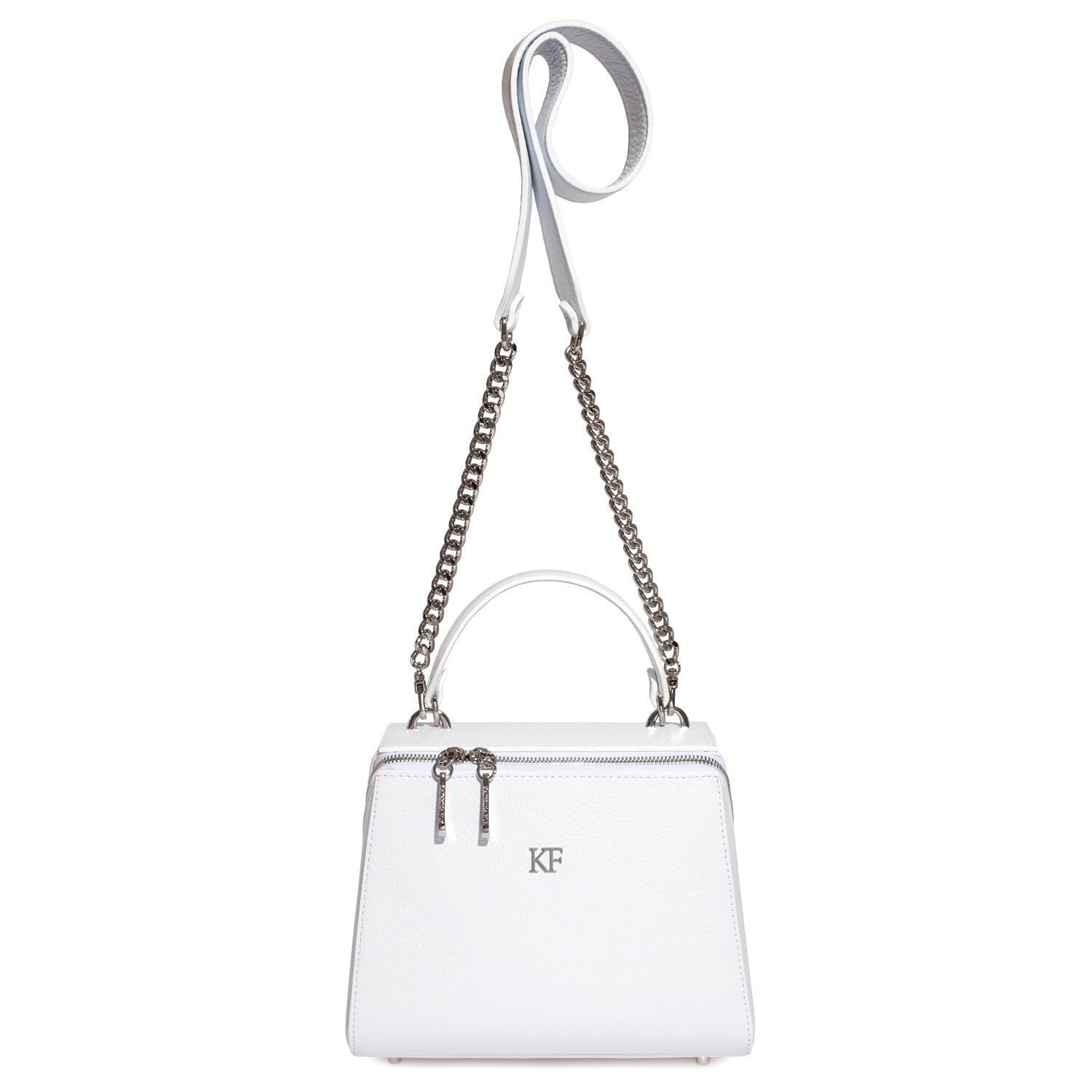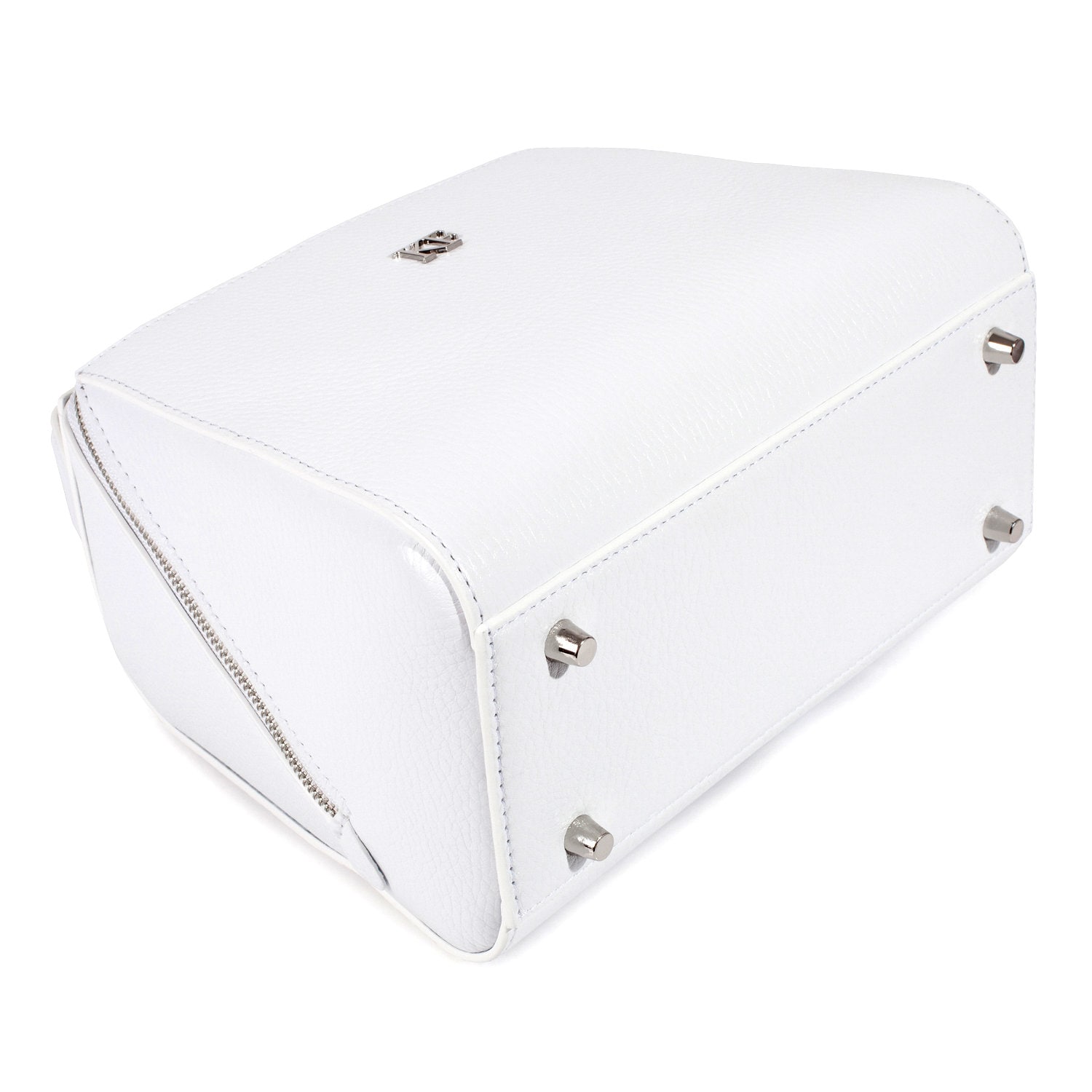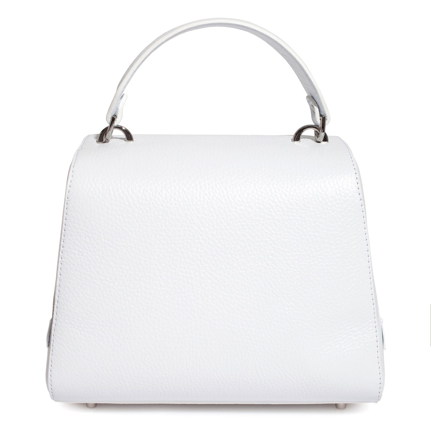 White genuine leather handbag from ukrainian designer Katerina Fox. This model is designed for women who appreciate the sleek design combined with functionality and comfort. High-quality and reliable hardware ensure long service bags. The internal space of a bag is equipped with one spacious compartment and two patch-pockets and one zipper pocket. The bag is closed with a zipper. The bottom of the bag is protected with metal legs. There is a long handle that allows you to wear the bag on the shoulder. The kit also includes a storage bag.