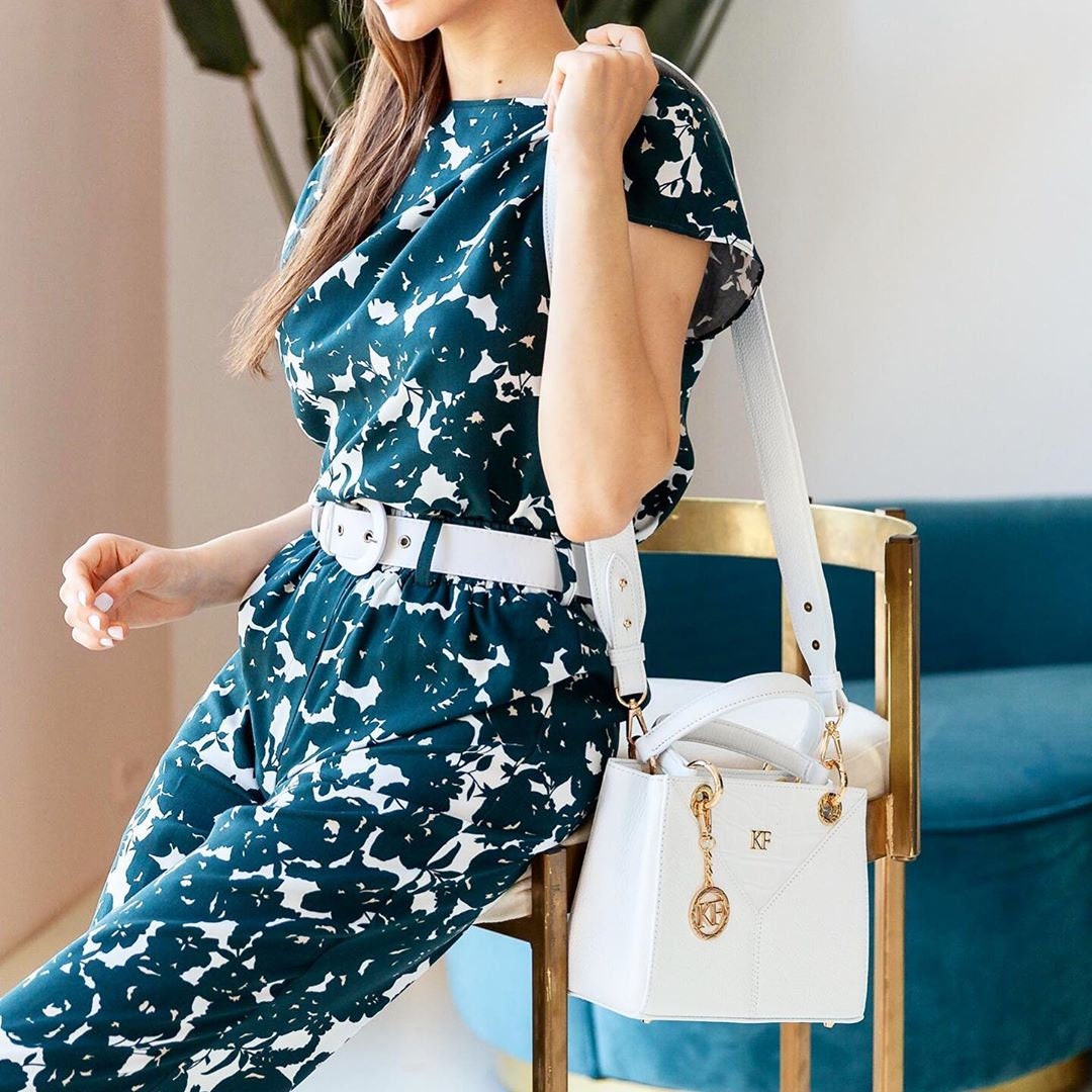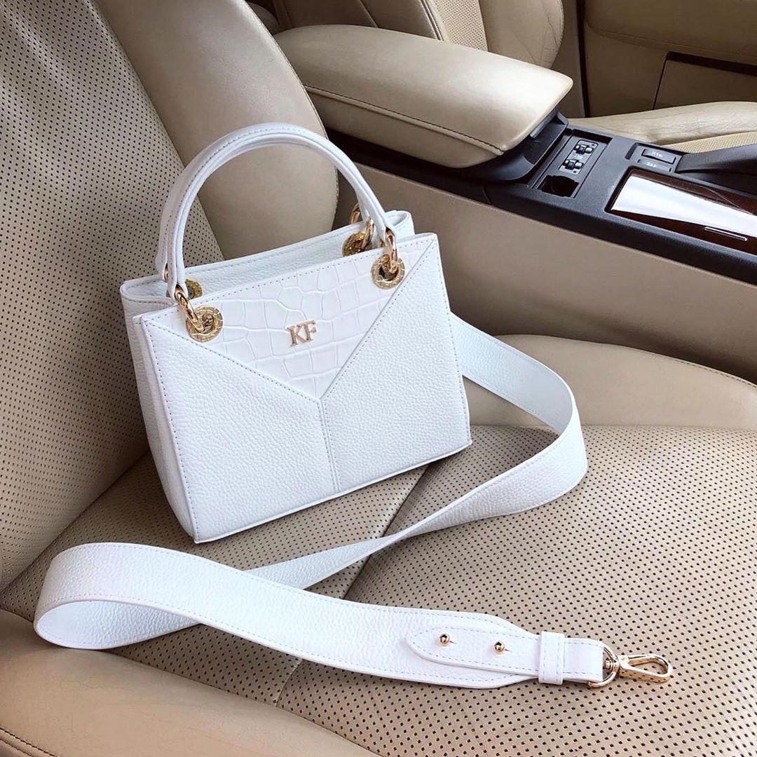 Delivery: In most cases our goods are shipped by FedEx or Ups Express. On rare occasions the goods might be shipped by Ukrposhta. The clients should check in advance an estimate of the amount of customs duty and value added tax.White genuine leather handbag from ukrainian designer Katerina Fox. This model is designed for women who appreciate the sleek design combined with functionality and comfort. Despite the simplicity, this bag stands out thanks to a triangular insert in black suede leather. High-quality and reliable hardware ensure long service bags. Inside the bag are three spacious compartments, one with zip, two patch pockets and one zippered pocket closes with a zipper. The bottom of the bag protected by metal feet.